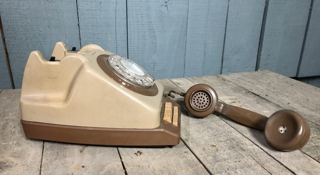 Super GPO Planset 2 tone desktop rotary brown & beige telephone with exchange selection buttons beneath the rotary dial.
