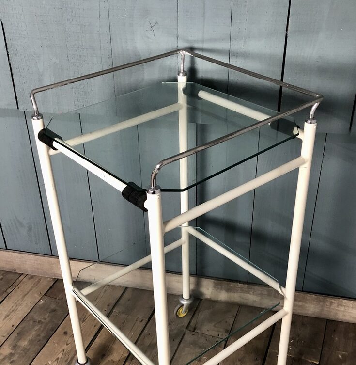 Stunning cream frame medical trolley with 2 glass shelves and chrome fiddle rail.