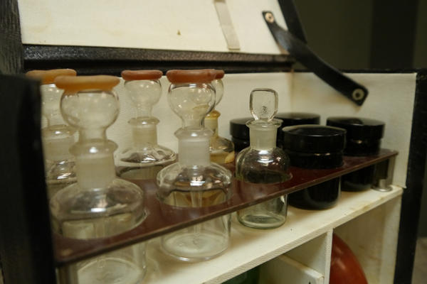 Beautiful leather cased Dr’s apothecary bag with carry handle. Folds down to reveal shelves and drawers with lovely period glass bottles with stoppers and layer of medical instruments.