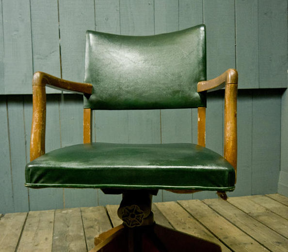 Beautiful oak frame swivel chair with dark green leather seat and back pad.