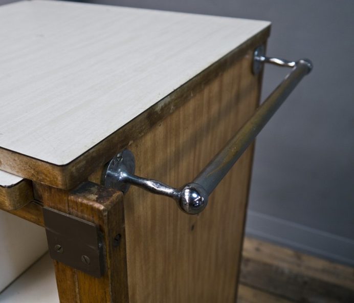 Period hospital wooden bedside lockers with Formica top, pull out shelf, towel rail and cabinet door to cupboard with space for a bible, which can be supplied.