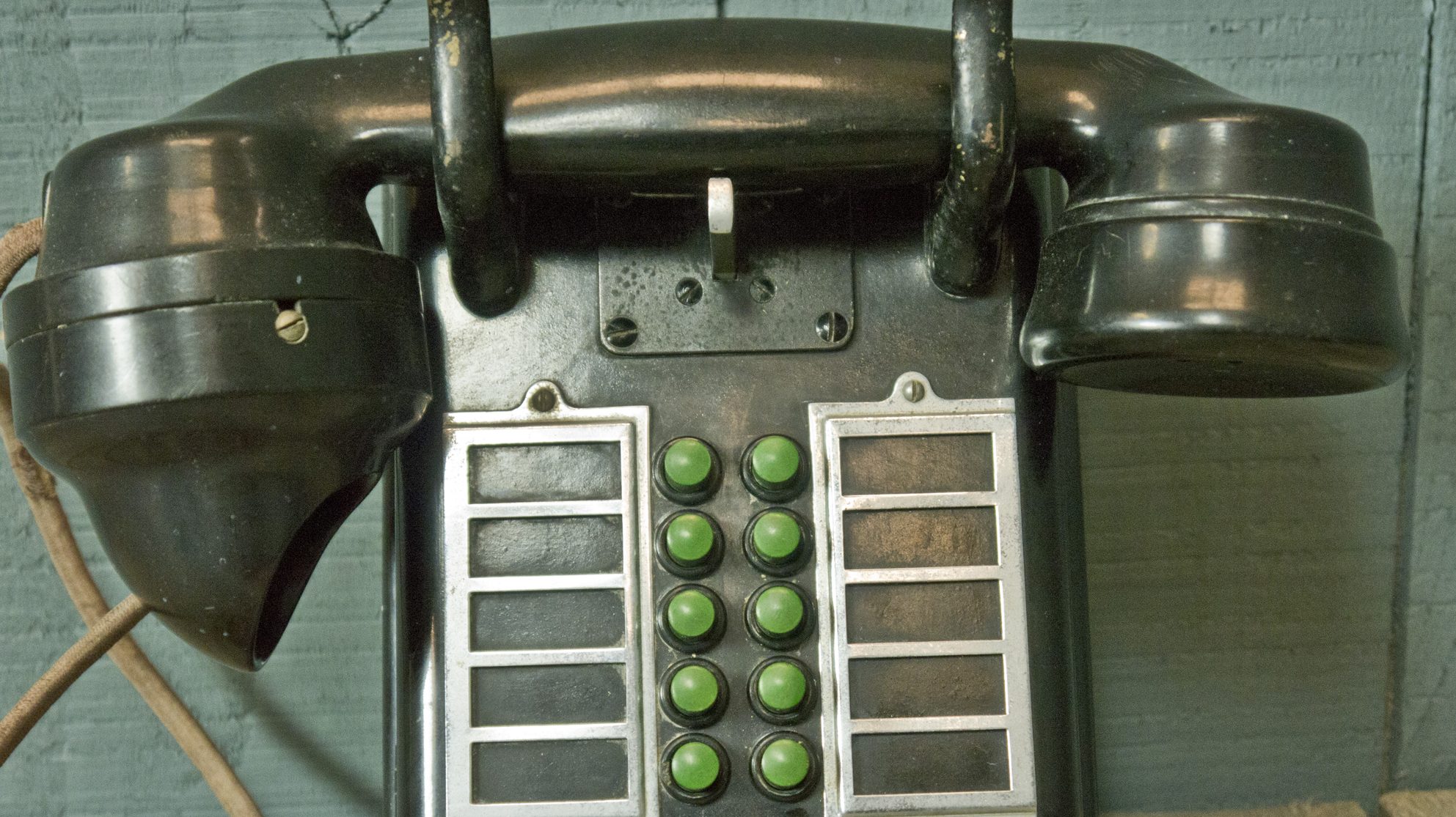 Black Bakelite wall mounted office telephone with 10 internal green buttons with index plate.