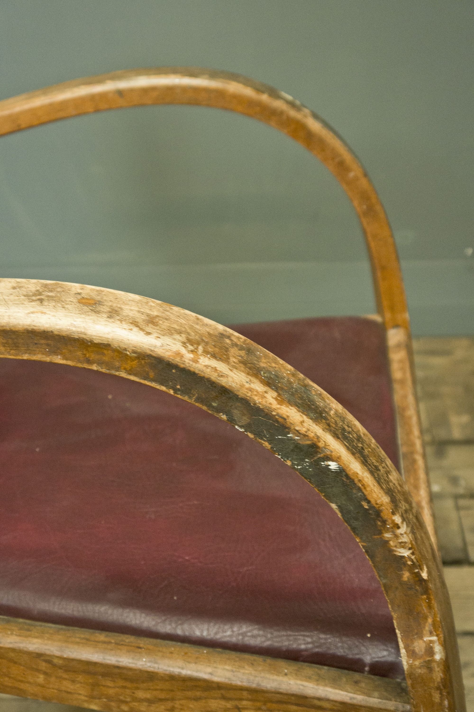 Beautiful worn oak frame chair with burgundy seat and back pad, curved arm rests.