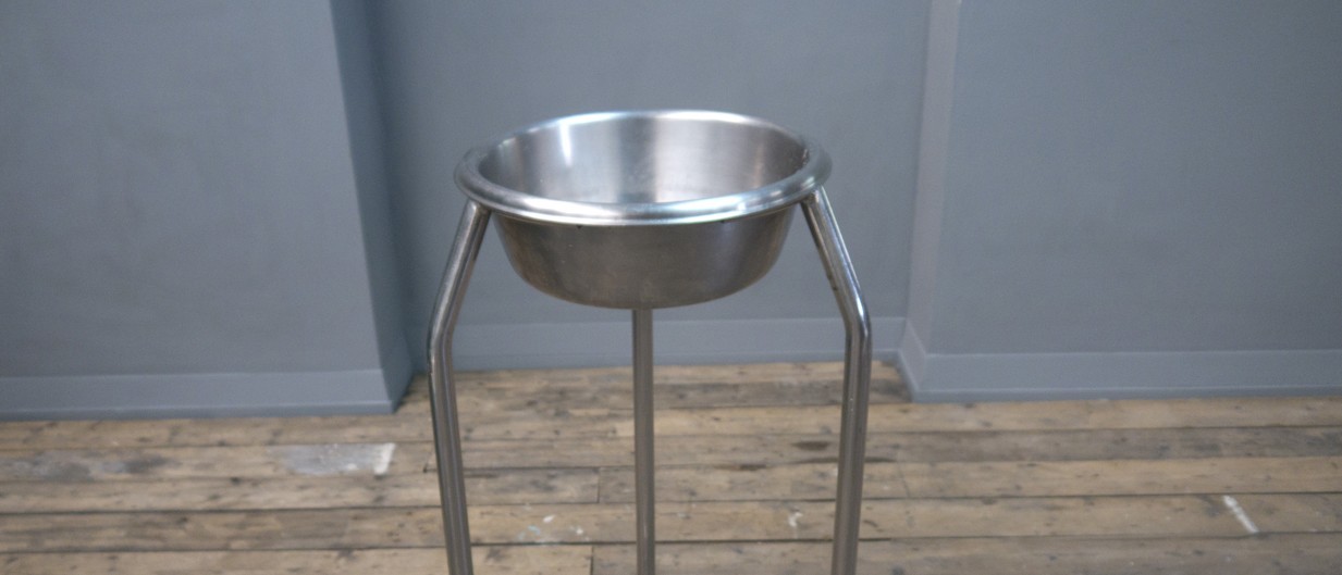 Removable steel bowl sits in wheeled stand. Used in operating theatres, wards and treatment rooms.