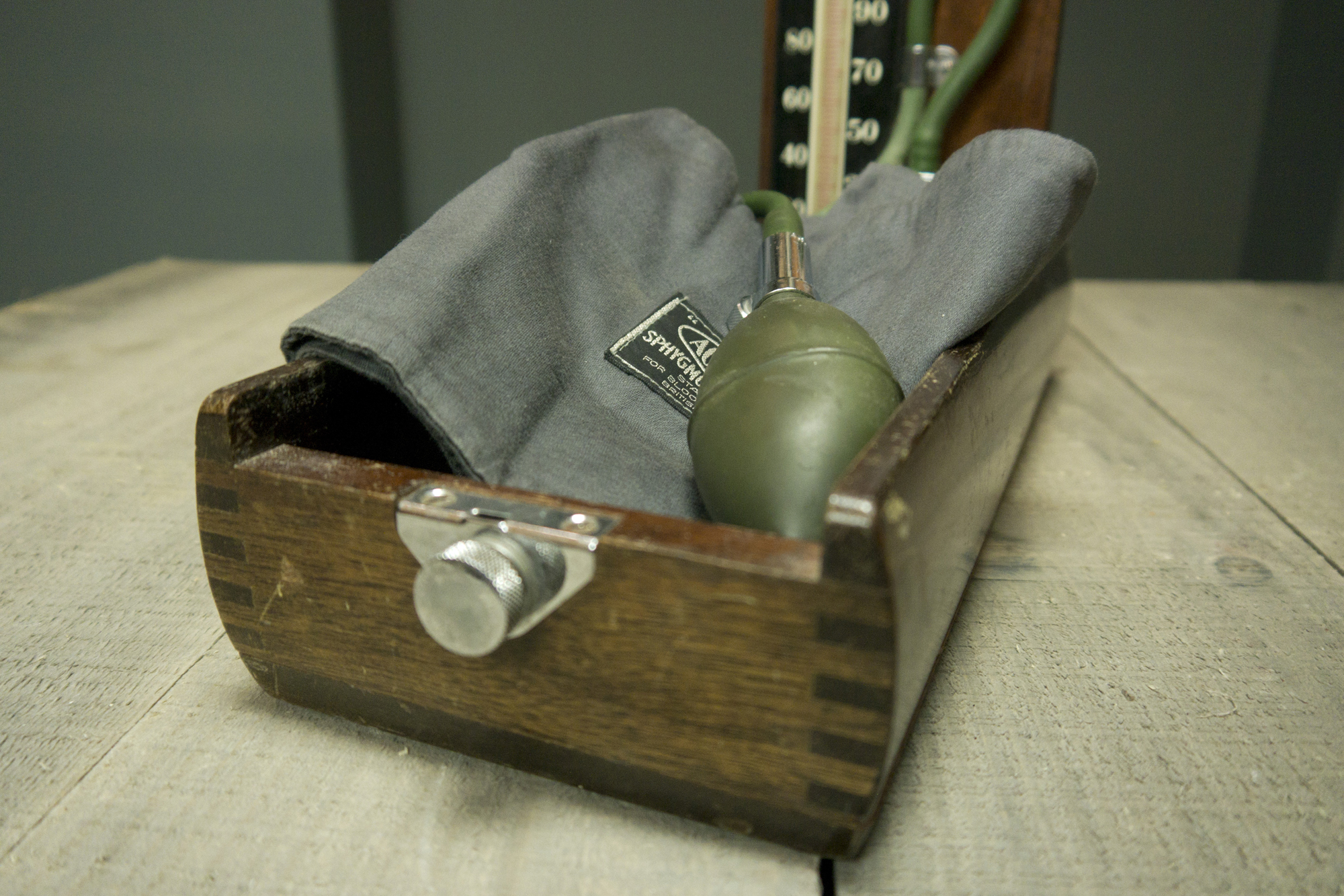 Lovely wood cased portable blood pressure kit.