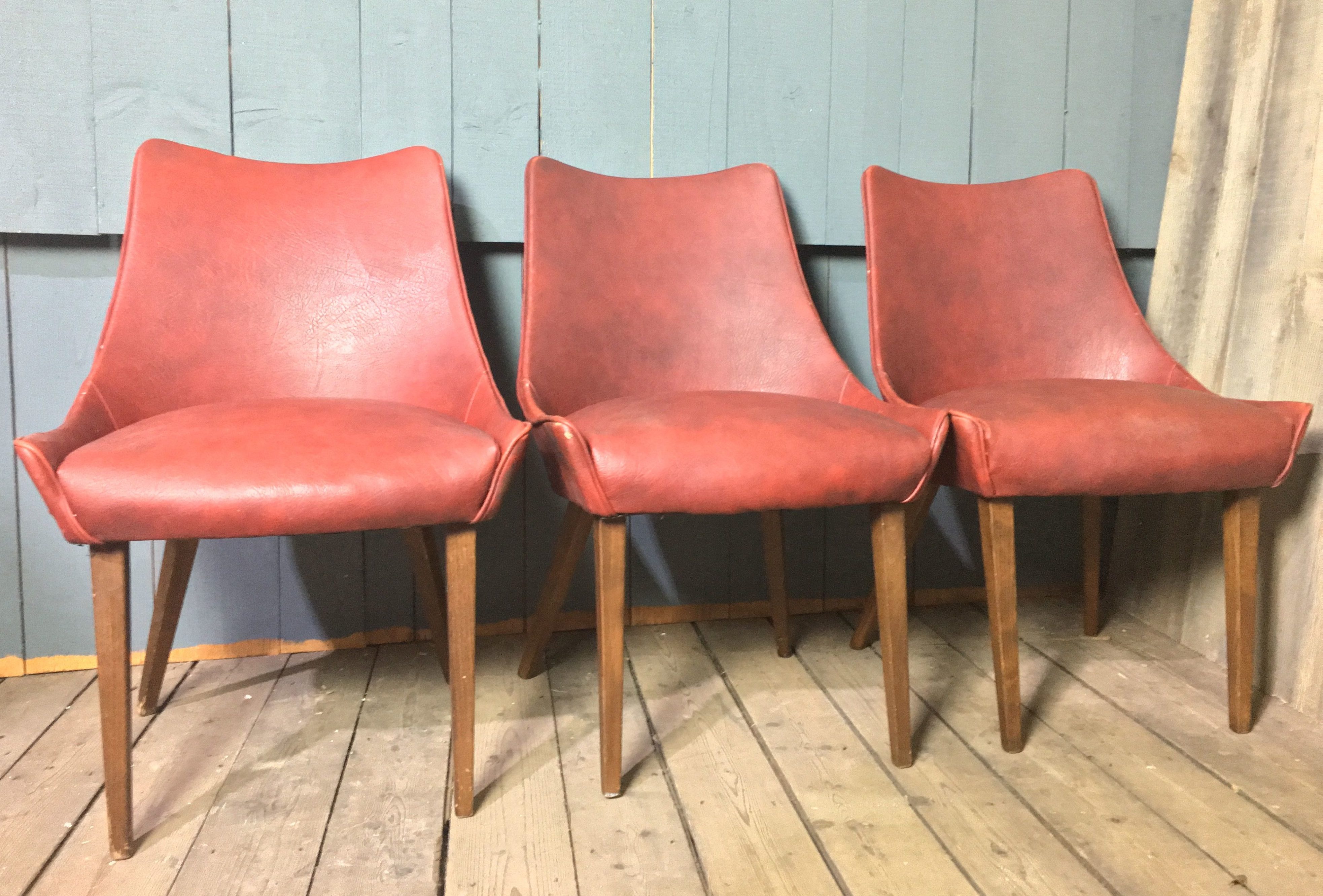 Lovely set of 3 dark mottled red vinyl deco style chairs on teak legs.