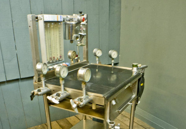 Stunning period anaesthetic trolley in stainless steel, complete with pull out table extension and base drawer. Used in conjunction with a Manley Ventilator.