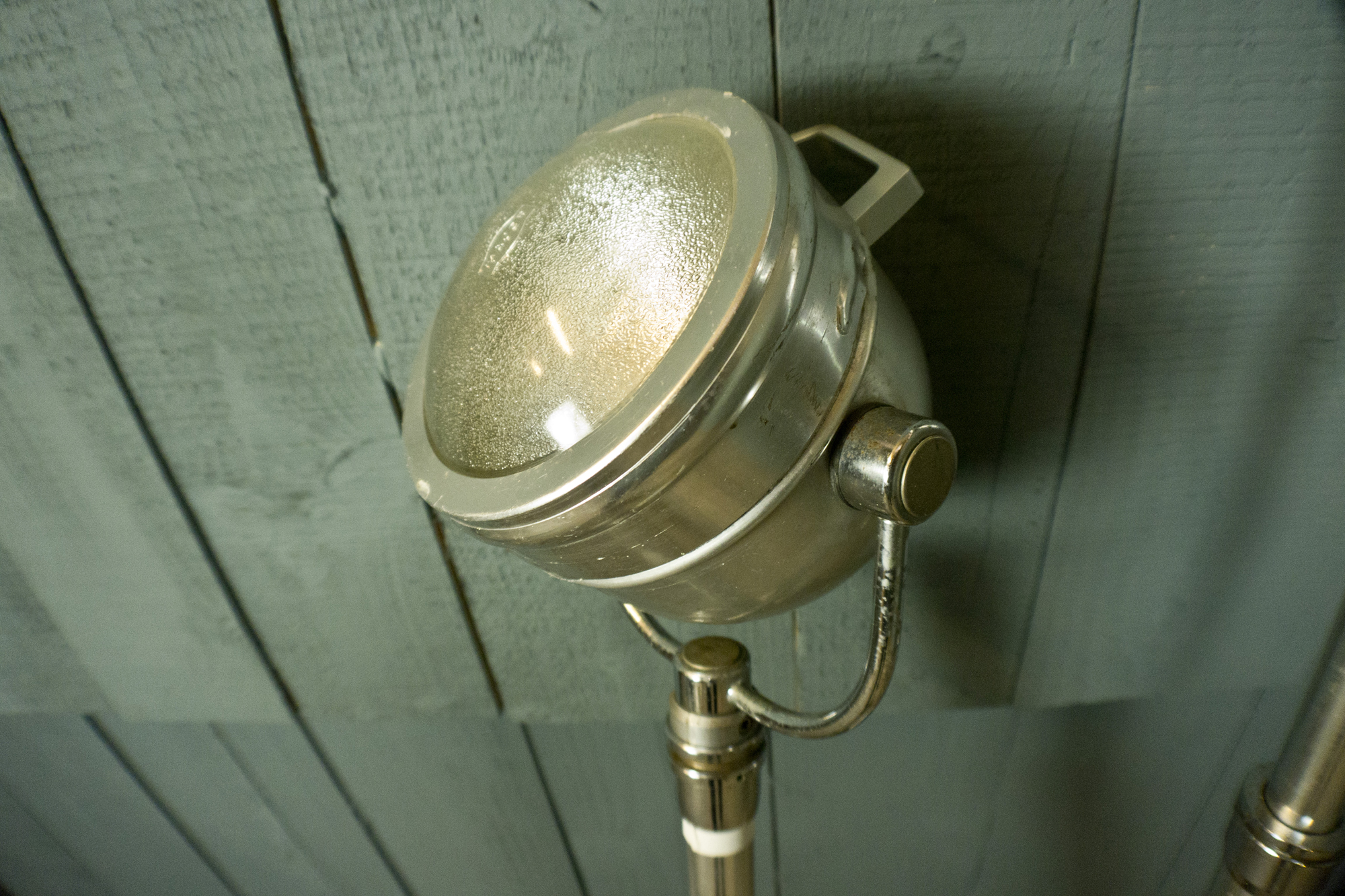Fabulous pair of chrome, wall mountable, operating theatre lights with telescopic capability. With grey rubber concertina pivot boot at wall mount.