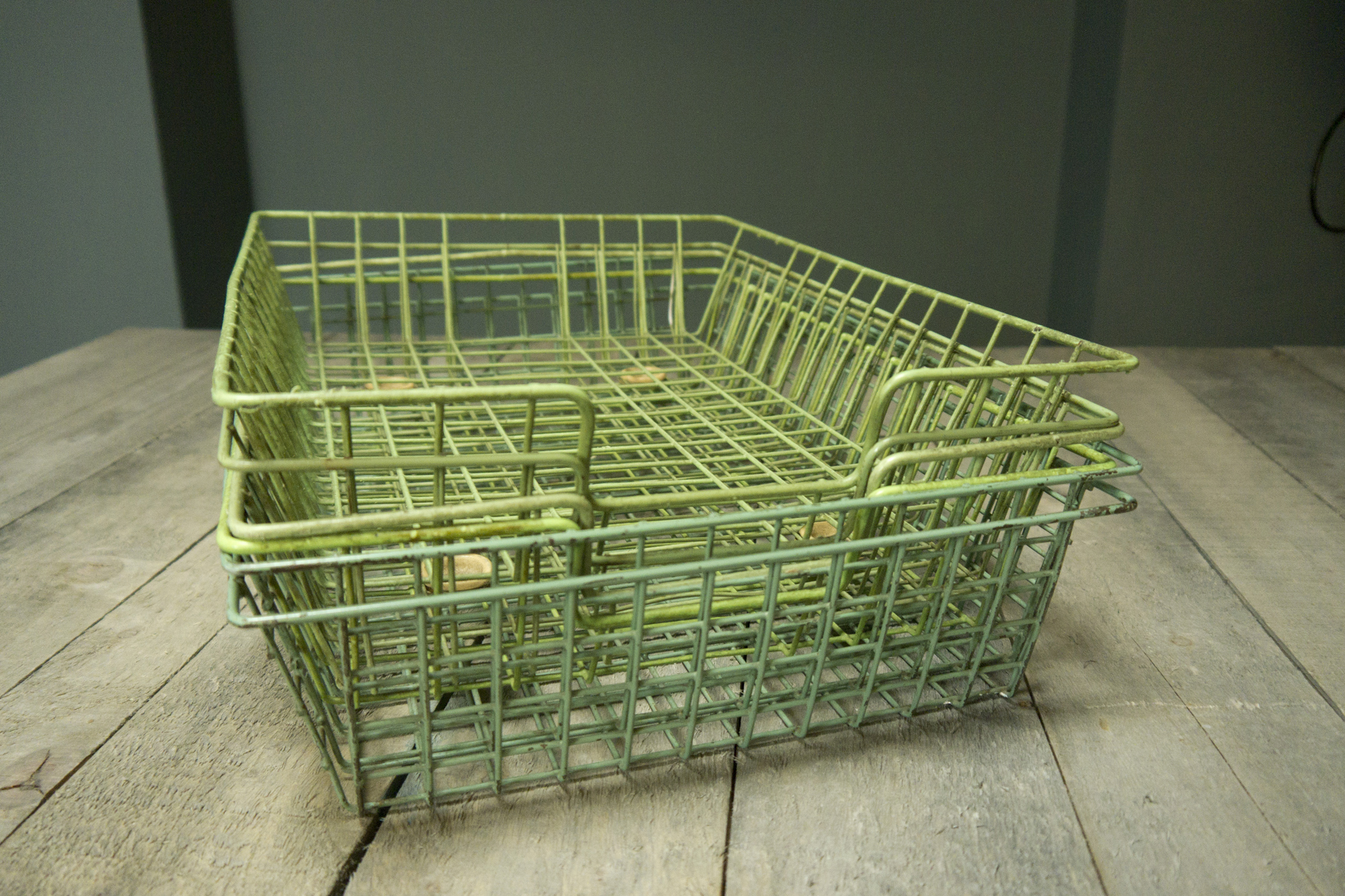Green coated wire in/out paperwork trays.