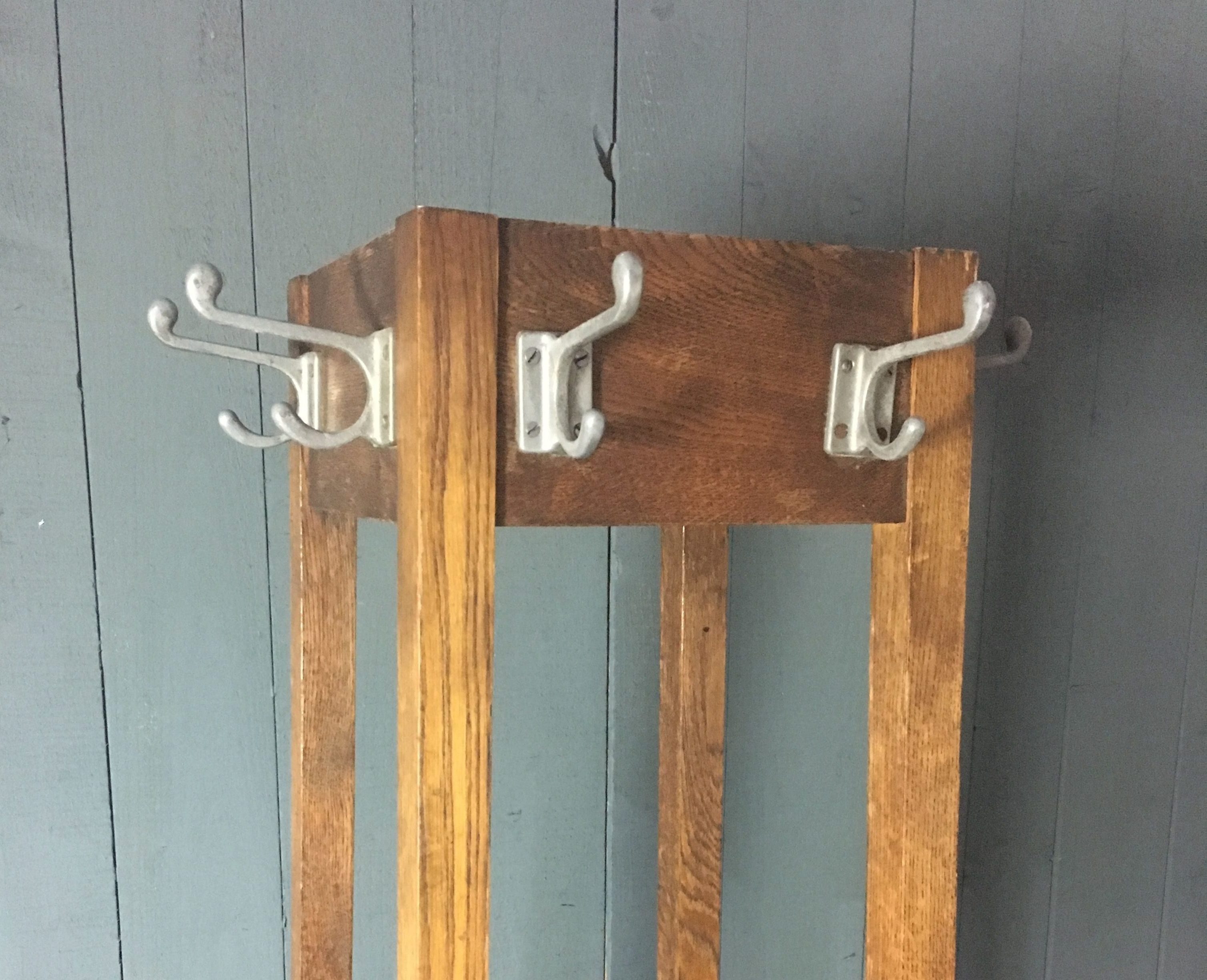 Lovely square Oak hall stand. Hooks for coats and hats. Mid support for umbrellas & walking sticks.