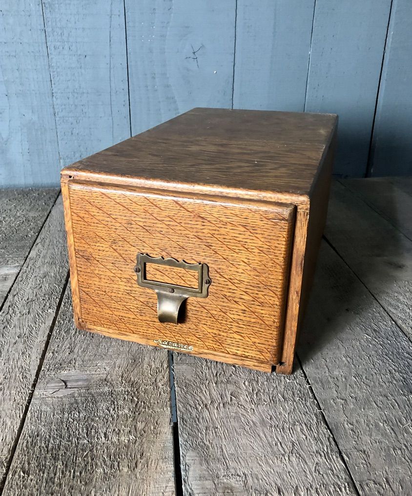 Beautiful grained wood index drawer desktop unit. Brass fingerpull and index indentification window.